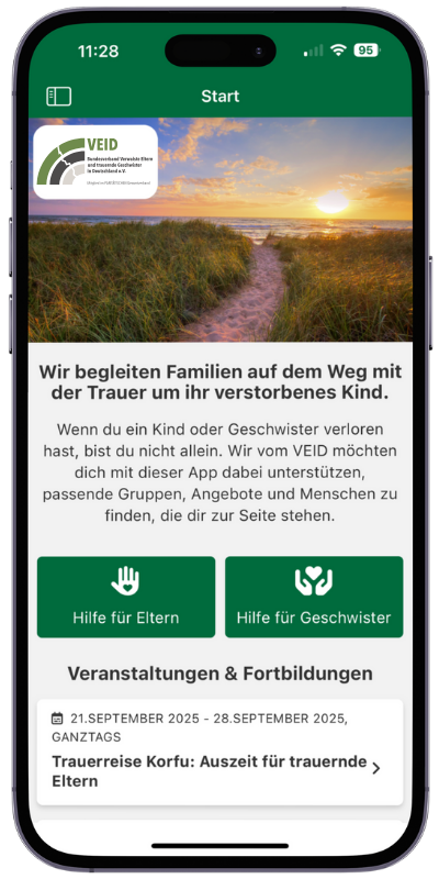 Mit der VEID-Trauerhelfer-App haben wir einen wichtigen Schritt gemacht! Die App unterstützt betroffene Familien und Mitglieder dabei, leichter miteinander in Kontakt zu kommen und auf einfachem Weg Hilfe und Austausch zu finden – überall und jederzeit.